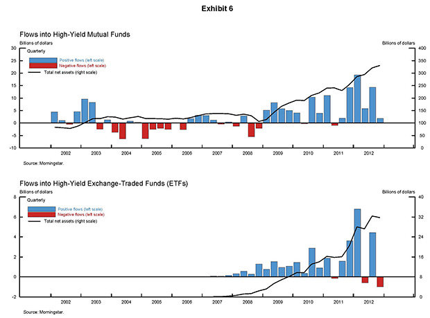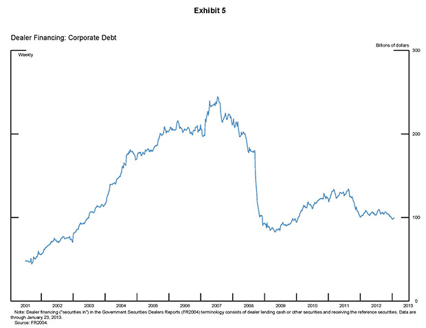 With this caveat in mind, it is worth noting the pattern of inflows into mutual funds and ETFs that hold high-yield bonds, shown in exhibit 6. Interestingly, the picture here is almost the reverse of that seen with dealer financing of corporate bonds. Assets under management in these vehicles were essentially flat in the years leading up to the crisis, but they have increased sharply in the past couple of years.19 This observation suggests, albeit only loosely, that there may be some substitutability between different forms of demandable finance. And it underscores the importance of not focusing too narrowly on any one category.
