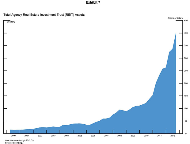 Continuing on with the theme of maturity transformation, the next brief stop on the tour is the agency mortgage real estate investment trust (REIT) sector. These agency REITs buy agency mortgage-backed securities (MBS), fund them largely in the short-term repo market in what is essentially a levered carry trade, and are required to pass through at least 90 percent of the net interest to their investors as dividends. As shown in exhibit 7, they have grown rapidly in the past few years, from $152 billion at year-end 2010 to $398 billion at the end of the third quarter of 2012.