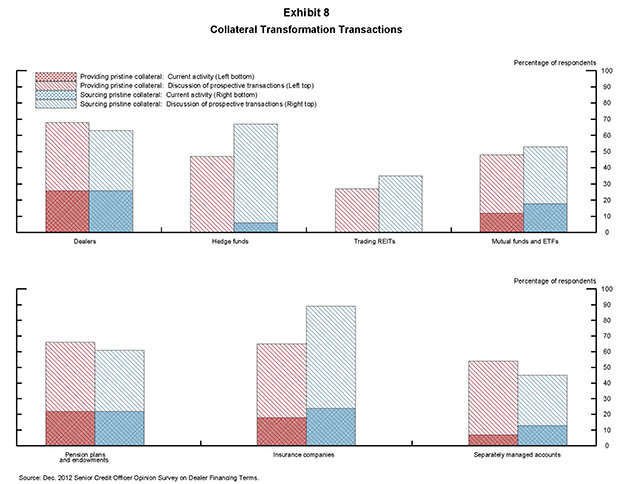As I said, we don't have evidence to suggest that the volume of such transactions is currently large. But with a variety of new regulatory and institutional initiatives on the horizon that will likely increase the demand for pristine collateral--from the Basel III Liquidity Coverage Ratio, to centralized clearing, to heightened margin requirements for noncleared swaps--there appears to be the potential for rapid growth in this area. Some evidence suggestive of this growth potential is shown in exhibit 8, which is based on responses by a range of dealer firms to the Federal Reserve's Senior Credit Officer Opinion Survey on Dealer Financing Terms.21 As can be seen, while only a modest fraction of those surveyed reported that they were currently engaged in collateral transformation transactions, a much larger share reported that they had been involved in discussions of prospective transactions with their clients.
