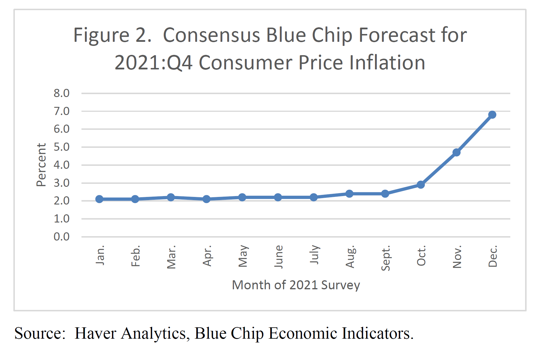 Same thing for the inflation forecast this year. As figure 2 shows, in January and February, the Blue Chip consensus was for consumer price inflation for Q4 to average about 2 percent. This forecast slowly ticked up to 2.4 percent through September. It was only in November that the consensus forecast moved above 4 percent and then jumped to 6.8 percent in the December survey. Just last Friday, November CPI inflation was reported at 6.8 percent for the 12 months ending November, the largest 12-month increase since mid-1982.