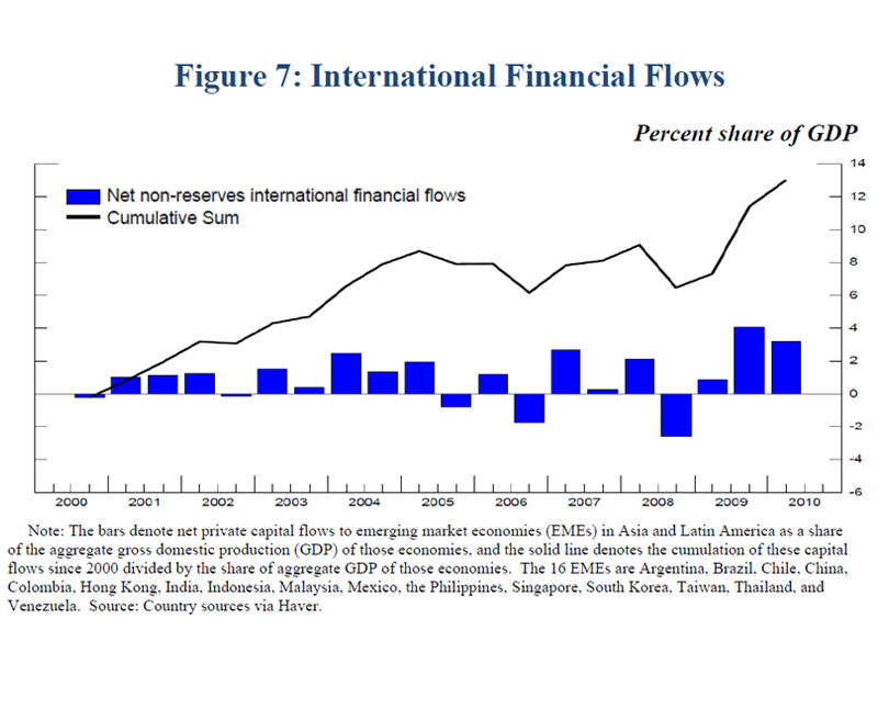 A related concern raised by some observers is that the Federal Reserve's asset purchases may induce excessive capital inflows to emerging market economies (EMEs)--inflows that in turn could put unwelcome upward pressure on the currencies of those EMEs and perhaps even contribute to asset price bubbles. As shown in figure 7, net private capital flows to Latin American and Asian EMEs (reported as a share of the aggregate GDP of those EMEs) were substantial in the second half of 2009 and the first half of 2010 but were not obviously outsized compared with levels prior to the crisis.18 A similar pattern is evident in figure 8, which depicts the net inflows since 2007 into mutual funds investing in EME bonds and equities. In each case, the strong inflows over the past year or so reflect a recovery in the wake of the large outflows that occurred during the crisis. In fact, the stock of claims on EMEs has only returned to its pre-crisis trend.