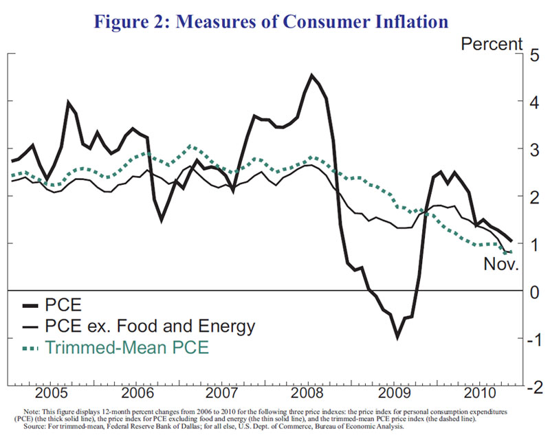 Such low rates of resource utilization are typically accompanied by falling inflation. And, indeed, as shown in figure 2, measures of inflation for personal consumption expenditures (PCE) have declined significantly since 2008. For the total PCE inflation rate, the underlying trend is obscured to some extent by large swings in energy prices. However, the downward trend is clearly evident from the evolution of core PCE inflation, which excludes the volatile prices of food and energy. The 12-month change in core PCE prices dropped from about 2-1/2 percent in mid-2008 to around 1‑1/2 percent in 2009 and declined further to less than 1 percent by late 2010.2