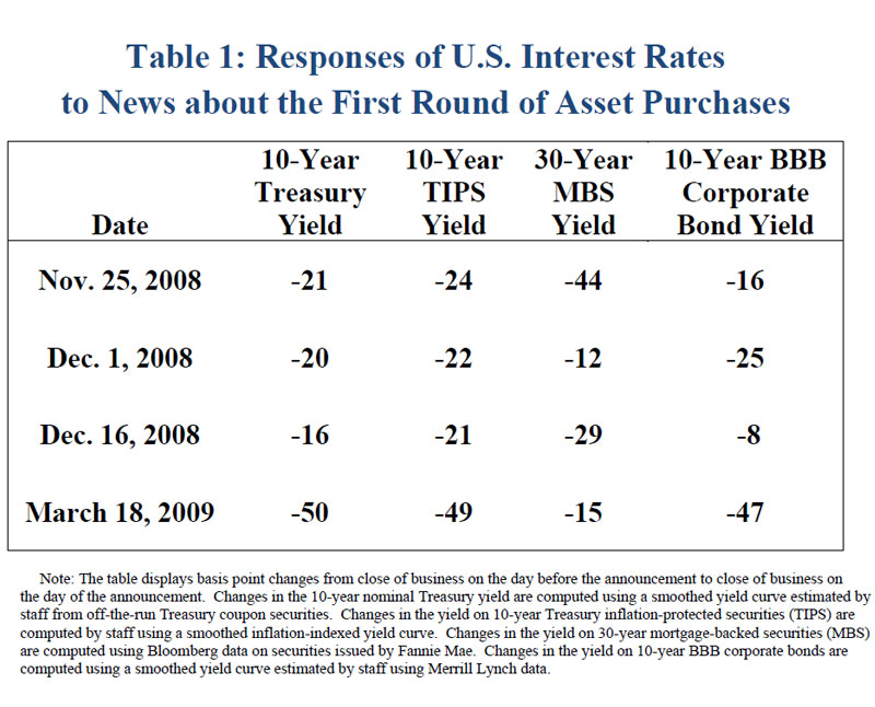 Table 1 summarizes the response of selected financial variables on four dates associated with the Federal Reserve's first round of asset purchases. On November 25, 2008, the Federal Reserve announced that it would purchase up to $600 billion in agency mortgage-backed securities (MBS) and agency debt. On December 1, Chairman Bernanke provided further details in a speech.6 On December 16, the program was formally launched by the FOMC.7 On March 18, 2009, the FOMC announced that the program would be expanded by an additional $850 billion in purchases of agency MBS and agency debt and $300 billion in purchases of Treasury securities. As is evident from the table, these announcements were generally associated with a substantial decline in the 10-year Treasury yield and the yield on 10-year Treasury inflation-protected securities (TIPS) as well as in rates on agency MBS and corporate debt.