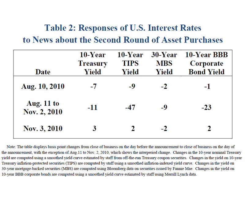 Is the program actually proving effective? My short answer is yes. Table 2 depicts financial market responses during three key phases in the rollout of the program: (1) August 10, 2010, when the FOMC announced that the Federal Reserve would begin reinvesting principal payments on agency MBS and agency debt by purchasing Treasury securities; (2) the period between August 11 and November 2; and (3) November 3, the date on which the FOMC meeting statement announced the commencement of the program.