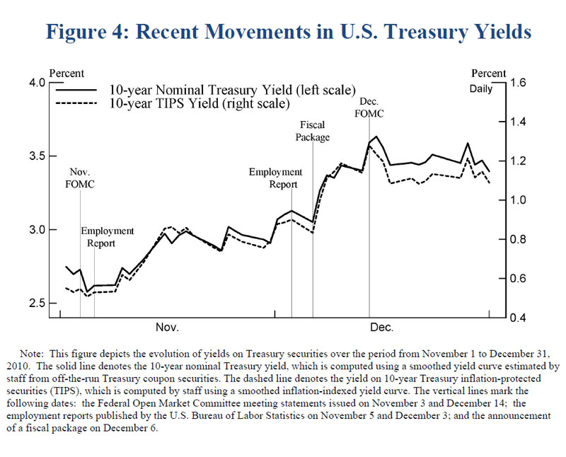 As shown in figure 4, longer-term Treasury yields have risen substantially over the past couple of months since the FOMC initiated this round of asset purchases. I believe that this increase in Treasury yields likely reflects a number of significant factors, including incoming information suggesting a somewhat stronger economic outlook and the fiscal package that was announced by President Obama in early December and approved by the Congress about two weeks later; that package will not only support economic growth next year but will also increase the amount of federal debt issuance. Also, investors appear to have scaled back their expectations about the extent to which the FOMC will engage in further purchases beyond those already announced; however, the effect of that reassessment on market rates tends to bolster the view that the Federal Reserve's securities purchases do indeed affect yields in the direction indicated by analytical and empirical studies.13
