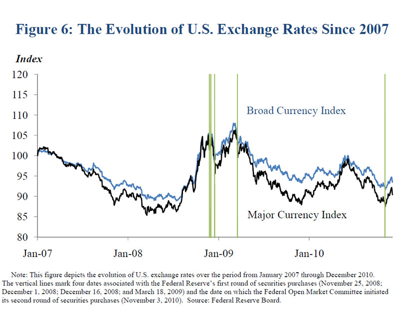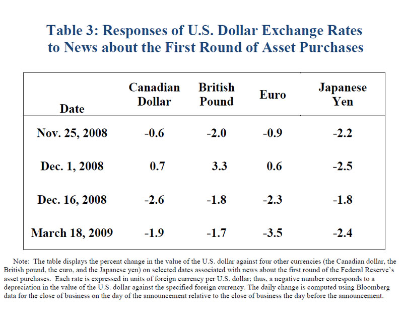 In fact, the evidence available to date suggests that the asset purchases have had only moderate effects on the foreign exchange value of the dollar. This point is illustrated in table 3, which reports the change in U.S. dollar exchange rates against four other currencies (the Canadian dollar, pound sterling, euro, and yen) on each of the four dates referred to in table 1. These movements in exchange rates are not particularly large when compared with the fluctuations that can occur in any given week or month. Indeed, as shown in figure 6, these exchange rate movements are very modest in the broader context of developments over the past several years.