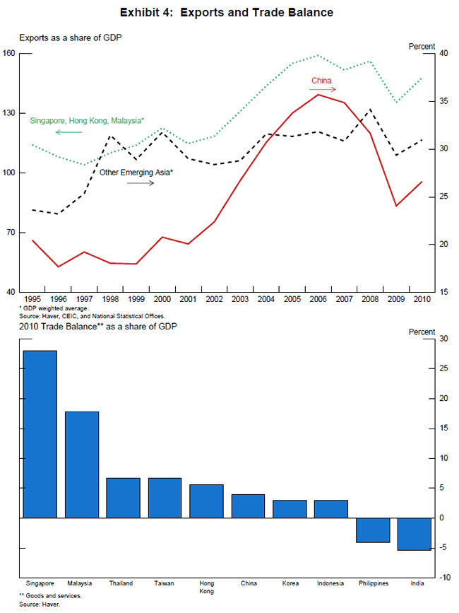 Partly as a result of those policy measures, the growth of the emerging Asian economies over the past several years appears to have relied less on external demand from the advanced economies. The top panel of exhibit 4 shows that the shares of exports in nominal GDP in the Asian economies have trended downwards since 2006 following a decade of solid increases. However, trade balances in the region (shown in the bottom panel of the exhibit) generally remain in surplus, notwithstanding some recent narrowing in several countries. These surpluses suggest that, on balance, the Asian economies continue to add more to global supply than to global demand.