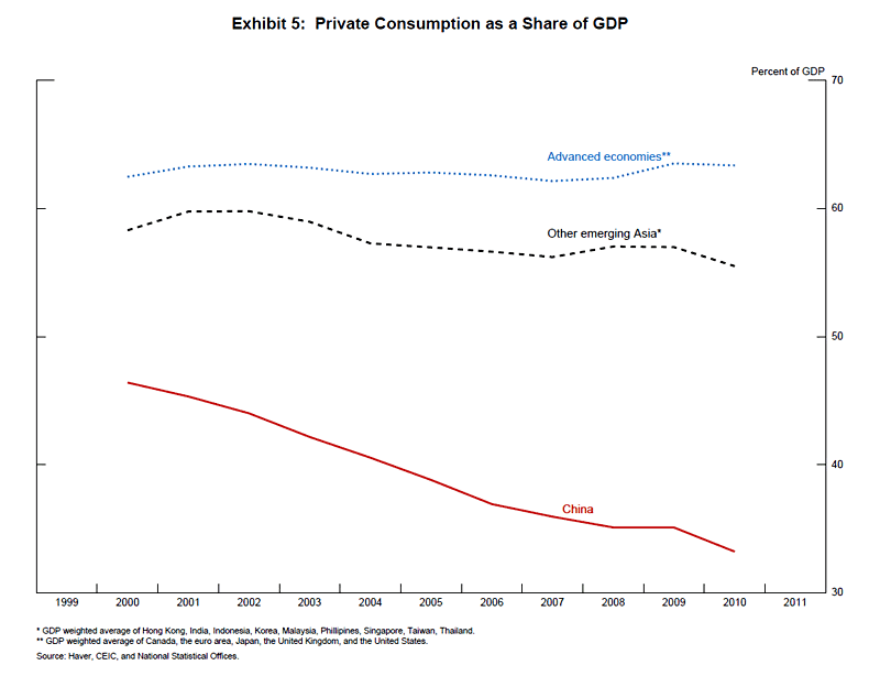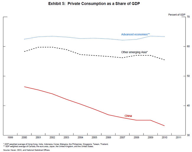 Crucially, private consumption as a share of output still remains quite low in several emerging Asian economies. Exhibit 5 shows that China's consumption share--the solid line--which was already well below that of other major economies in 2000, has fallen steadily over the past decade to about one-third of its GDP.2 Private consumption shares in other emerging Asian economies--the dashed line--are also significantly below those in the advanced economies--the dotted line--and have not moved up in the wake of the global financial crisis.