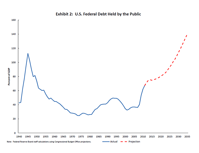 Turning now to U.S. fiscal policy, with the onset of the recent recession and financial crisis, the federal budget deficit widened significantly and has remained wide. Exhibit 2 shows that, as a result, federal debt held by the public has increased relative to our national income to a level not seen in the past half-century. These budget developments have reflected both the weak economy, which has depressed revenues and pushed up expenditures, and the fiscal stimulus that was implemented to help ease the recession and support the recovery. So long as the economy continues to recover, the deficit should narrow over the next several years as a growing economy boosts revenues and reduces expenditures and as the policies put in place to provide economic stimulus continue to wind down. Even so, the ratio of debt to gross domestic product (GDP) will continue to edge higher over the next decade unless the Congress and the Administration are able to agree on a program of deficit reduction that is more ambitious than the targets incorporated in last summer's Budget Control Act. Looking yet further out, it is apparent that, absent significant policy shifts, budget pressures resulting from the aging of the U.S. population and fast-rising health-care costs will continue to push the federal debt ratio higher in coming decades. The dashed line in exhibit 2 shows the Congressional Budget Office's long-term projection of the debt-to-GDP ratio through 2035 under current policy settings, including the effects of the Budget Control Act.