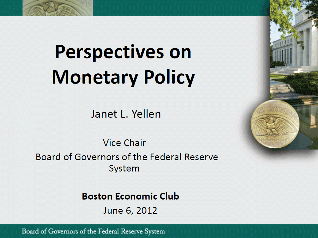 In my remarks this evening I have sought to explain why, in my view, a highly accommodative monetary policy will remain appropriate for some time to come. My views concerning the stance of monetary policy reflect the FOMC's firm commitment to the goals of maximum employment and stable prices, my appraisal of the medium term outlook (which is importantly shaped by the persistent legacy of the housing bust and ensuing financial crisis), and by my assessment of the balance of risks facing the economy. Of course, as I've emphasized, the outlook is uncertain and the Committee will need to adjust policy as appropriate as actual conditions unfold. For this reason, the FOMC's forward guidance is explicitly conditioned on its anticipation of "low rates of resource utilization and a subdued outlook for inflation over the medium run."23 If the recovery were to proceed faster than expected or if inflation pressures were to pick up materially, the FOMC could adjust policy by bringing forward the expected date of tightening. In contrast, if the Committee judges that the recovery is proceeding at an insufficient pace, we could undertake portfolio actions such as additional asset purchases or a further maturity extension program. It is for this reason that the FOMC emphasized, in its statement following the April meeting, that it would "regularly review the size and composition of its securities holdings and is prepared to adjust those holdings as appropriate to promote a stronger economic recovery in a context of price stability."24