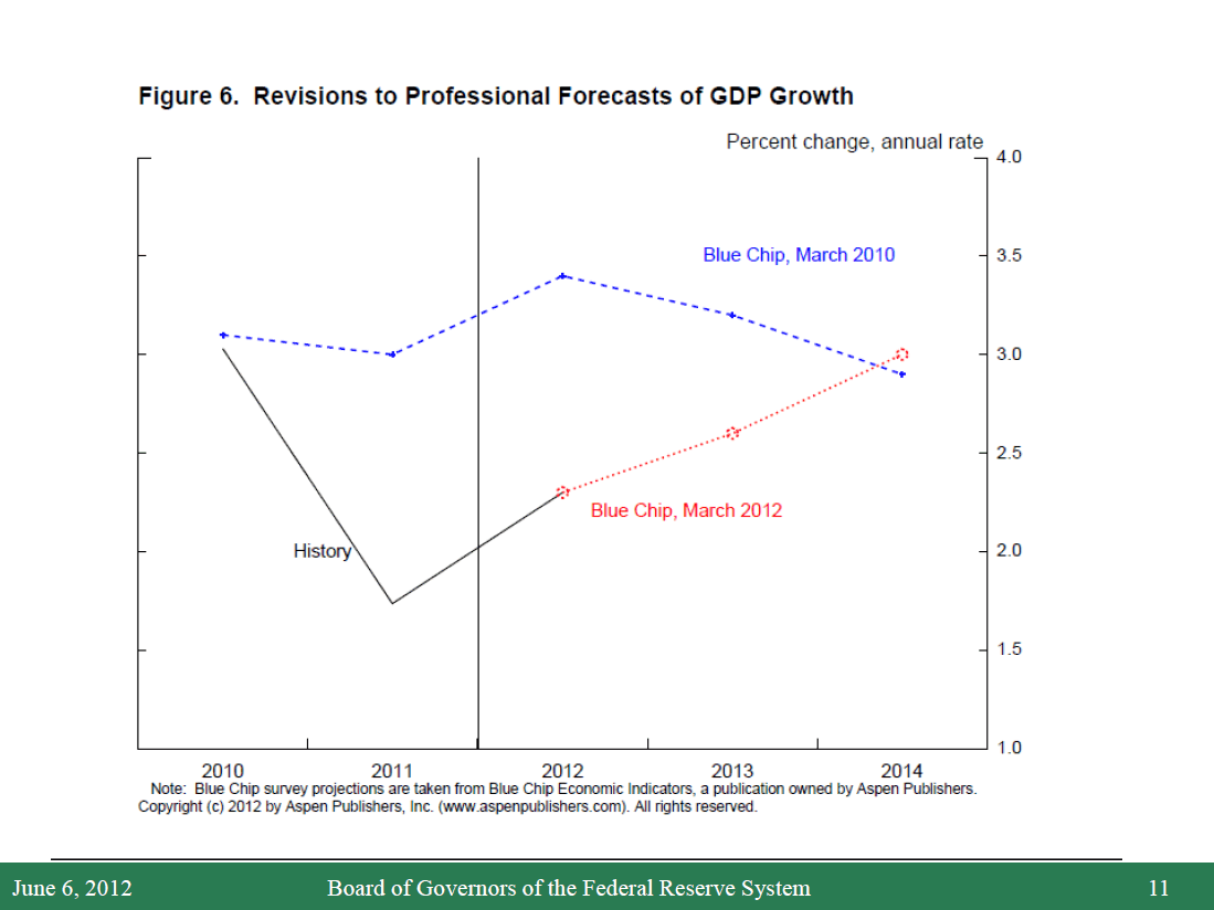 3. The SPF released in May provides forecasts on a quarterly basis through mid-2013 and annual projections beyond that date. To construct quarterly forecasts through the end of 2014, I interpolate the annual projections. Return to text