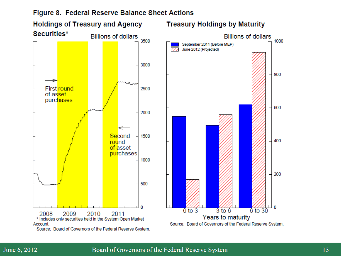 The FOMC has also provided further monetary accommodation over time by altering the size and composition of the Federal Reserve's securities holdings, shown in figure 8. The expansion in the volume of securities held by the Federal Reserve is shown in the left panel of the figure. During 2009 and early 2010, the Federal Reserve purchased about $1.4 trillion in agency mortgage-backed securities and agency debt securities and about $300 billion in longer-term Treasury securities. In November 2010, the Committee initiated an additional $600 billion in purchases of longer-term Treasury securities, which were completed at the end of June of last year. Last September, the FOMC decided to implement the "Maturity Extension Program," which affected the maturity composition of our Treasury holdings as shown in the right panel. Through this program, the FOMC is extending the average maturity of its securities holdings by selling $400 billion of Treasury securities with remaining maturities of 3 years or less and purchasing an equivalent amount of Treasury securities with remaining maturities of 6 to 30 years. These transactions are currently scheduled to be completed at the end of this month.
