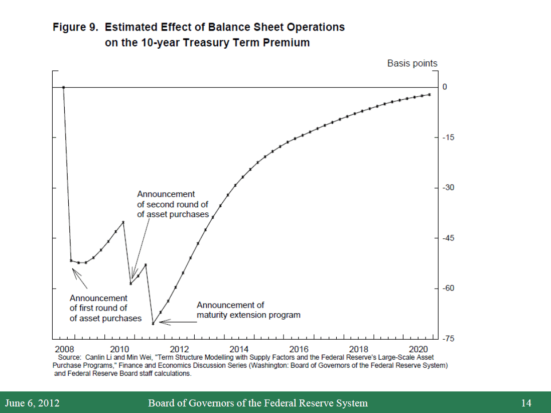 10. The term premium on a longer-dated Treasury security is defined as the return that investors expect to earn on holding this security in excess of the return from rolling over short-dated Treasury securities, such as three-month Treasury bills. For estimates of the Federal Reserve's balance-sheet actions on long-term interest rates, see Canlin Li and Min Wei (forthcoming), "Term Structure Modeling with Supply Factors and the Federal Reserve's Large Scale Asset Purchase Programs," Finance and Economics Discussion Series (Washington: Board of Governors of the Federal Reserve System); Joseph Gagnon, Matthew Raskin, Julie Remache, and Brian Sack (2010), "Large-Scale Asset Purchases by the Federal Reserve: Did they Work? (PDF)" Staff Report no. 441 (New York: Federal Reserve Bank of New York, March); Hess Chung, Jean-Philippe Laforte, David Reifschneider, and John Williams (2012), "Have We Underestimated the Likelihood and Severity of Zero Lower Bound Events?" supplement, Journal of Money, Credit and Banking, vol. 44 (S1, February), 47-82; Arvind Krishnamurthy and Annette Vissing-Jorgensen (2011), "The Effects of Quantitative Easing on Interest Rates: Channels and Implications for Policy," Brookings Papers on Economic Activity, Fall, 215-65, www.brookings.edu/about/projects/bpea/editions/fall-2011; and James Hamilton and Jing Cynthia Wu (2012), "The Effectiveness of Alternative Monetary Policy Tools in a Zero Lower Bound Environment," Journal of Money, Credit and Banking, vol. 44 Issue Supplement s1 (February), 3-46. Estimates of the effects of large-scale asset purchases in the United Kingdom are provided in Michael Joyce, Matthew Tong, and Robert Woods (2011), "The United Kingdom's Quantitative Easing Policy: Design, Operation and Impact (PDF)," Bank of England Quarterly Bulletin, Third Quarter, 200-12. Return to text