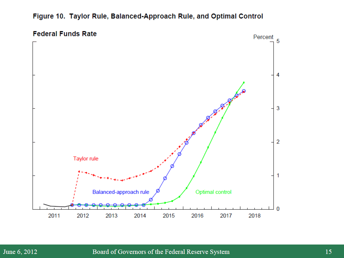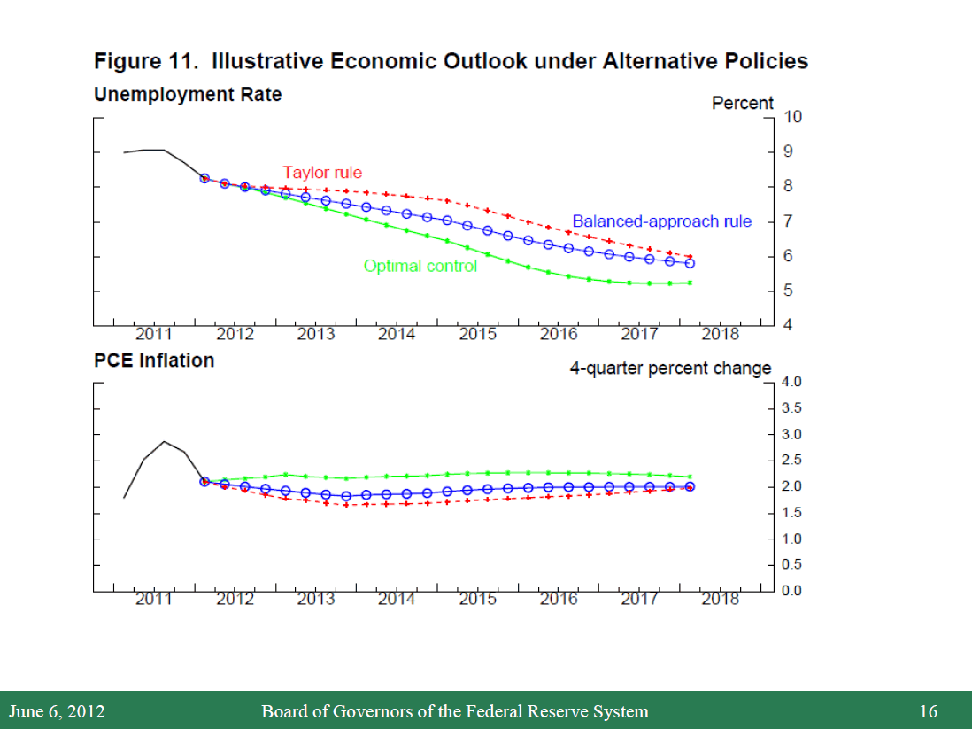 20. This procedure involves two steps. First, the FRB/US model’s projections of real activity, inflation, and interest rates are adjusted to replicate the baseline forecast values. Second, a search procedure is used to solve for the path of the federal funds rate that minimizes the value of an assumed loss function, allowing for feedback of changes in the federal funds rate from baseline to real activity and inflation. For the purposes of the exercise, the loss function is equal to the cumulative discounted sum from 2012:Q2 through 2025:Q4 of three factors--the squared deviation of the unemployment rate from 5-1/2 percent, the squared deviation of overall PCE inflation from 2 percent, and the squared quarterly change in the federal funds rate. The third term is added to damp quarter-to-quarter movements in interest rates. Return to text
