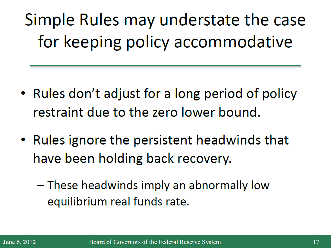 As I noted, simple rules have the advantage of delivering good policy outcomes across a broad range of models, and are thereby relatively robust to our limited understanding of the precise working of the economy--in contrast to optimal-control policies, whose prescriptions are sensitive to the specification of the particular model used in the analysis. However, simple rules also have their shortcomings, leading them to significantly understate the case for keeping policy persistently accommodative in current circumstances.