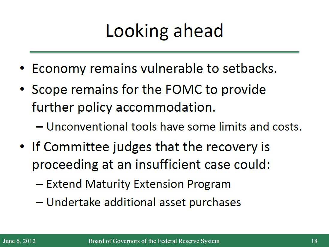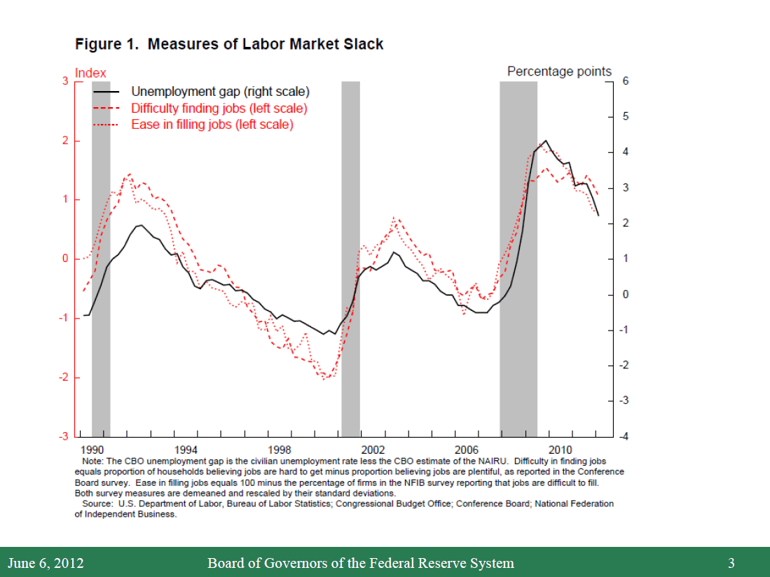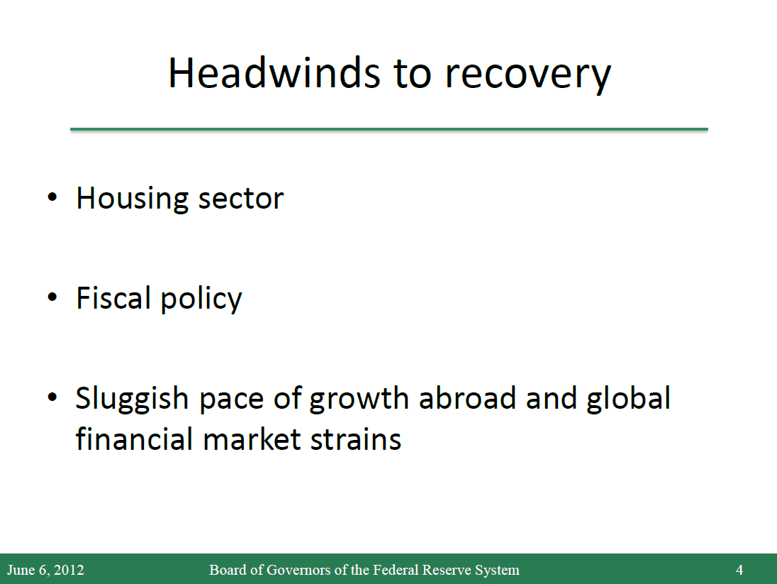 Starting with the labor market, conditions have gradually improved over the past year, albeit at an uneven pace. Average monthly payroll gains picked up from about 145,000 in the second half of 2011 to 225,000 during the first quarter of this year. However, these gains fell back to around 75,000 a month in April and May. The deceleration of payroll employment from the first to the second quarter was probably exacerbated by some combination of seasonal adjustment difficulties and an unusually mild winter that likely boosted employment growth earlier in the year. Payback for that earlier strength probably accounts for some of the weakness we've seen recently. Smoothing through these fluctuations, the average pace of job creation for the year to date, as well as recent unemployment benefit claims data and other indicators, appear to be consistent with an economy expanding at only a moderate rate, close to its potential.