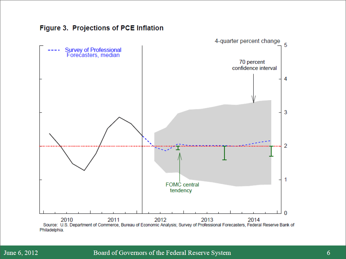 Turning to inflation, figure 3 summarizes private and FOMC forecasts. Overall consumer price inflation has fluctuated quite a bit in recent years, largely reflecting movements in prices for oil and other commodities. In early 2011 and again earlier this year, prices of crude oil, and thus of gasoline, rose noticeably. Smoothing through these fluctuations, inflation as measured by the price index for personal consumption expenditures (PCE) averaged near 2 percent over the past two years. In recent weeks, however, oil and gasoline prices have moderated and are now showing through to the headline inflation figures. Looking ahead, most FOMC participants at the time of our April meeting expected inflation to be at, or a bit below, our long-run objective of 2 percent through 2014; private forecasters on average also expect inflation to be close to 2 percent. As with unemployment, uncertainty around the inflation projection is substantial.