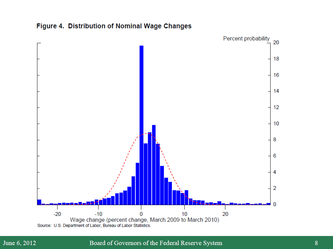 6. The data shown in figure 4 refers to the change in wages over the twelve months to March 2010. See Bruce Fallick, Michael Lettau, and William Wascher (2011), "Downward Nominal Wage Rigidity in the United States during the Great Recession," unpublished manuscript, November. Similar results, based on a different source of data, are reported in Mary Daly, Bart Hobijn, and Brian Lucking (2012), "Why has Wage Growth Stayed Strong?" Federal Reserve Bank of San Francisco, FRBSF Economic Letter 2012-10, April 2. I have explored the implications of downward nominal rigidity for the Phillips curve and stabilization policy in greater depth in Janet L. Yellen and George A. Akerlof (2006), "Stabilization Policy: A Reconsideration," Economic Inquiry, vol. 44 (January), pp. 1-22. Return to text