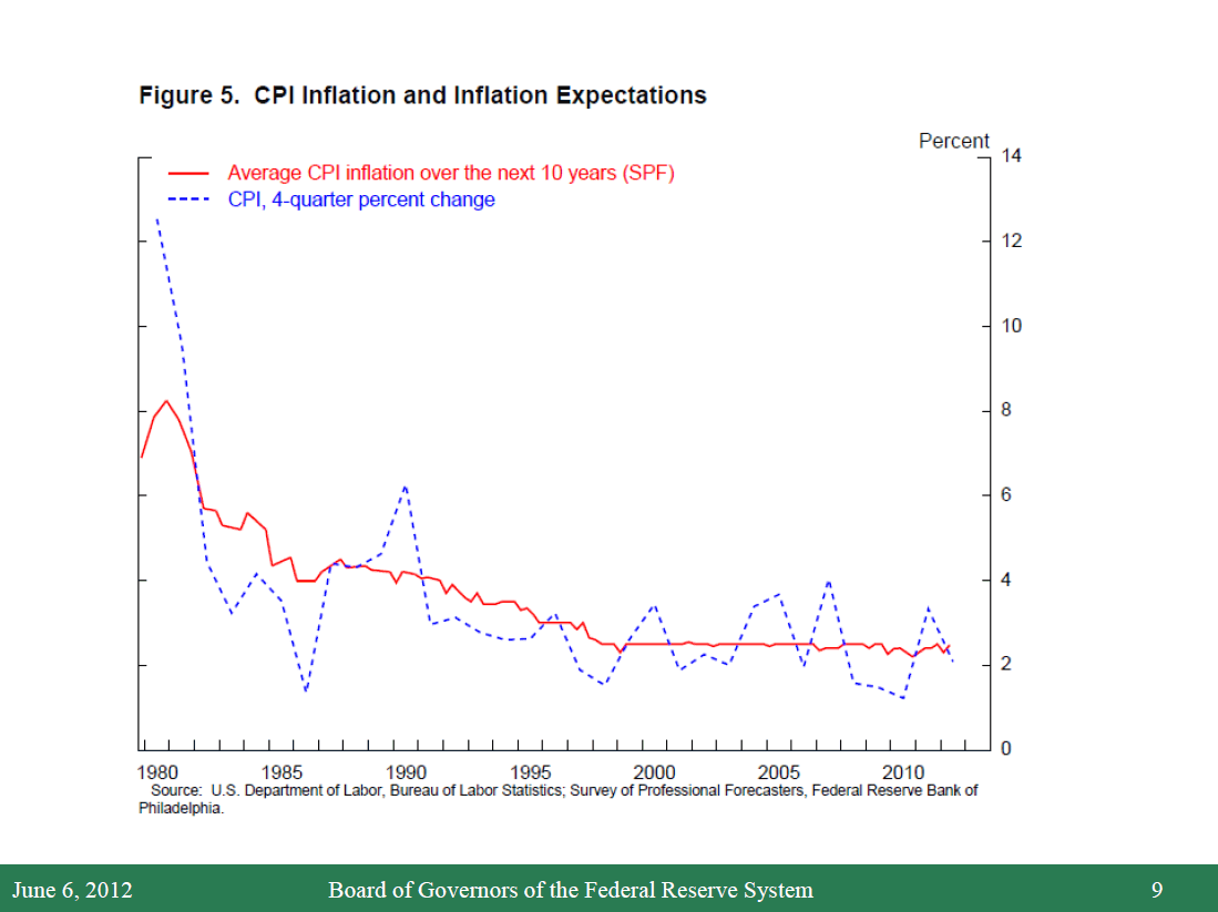 Anchored inflation expectations are another reason why inflation has remained close to 2 percent in the face of very low resource utilization. As shown in figure 5, survey measures of longer-horizon inflation expectations have remained nearly constant since the mid-1990s even as actual inflation has fluctuated. As a result, the current slump has not generated the downward spiral of falling expected and actual inflation that a simple accelerationist model of inflation might have predicted. Indeed, keeping inflation expectations from declining has been an important success of monetary policy over the past few years. At the same time, the fact that longer-term inflation expectations have not risen above 2 percent has also proved extremely valuable, for it has freed the FOMC to take strong actions to support the economic recovery without greatly worrying that higher energy and commodity prices would become ingrained in inflation and inflation expectations, as they did in the 1970s.