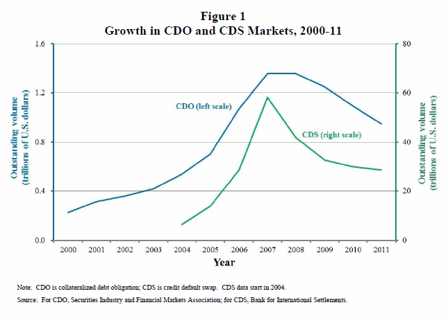 4. See Securities Industry and Financial Markets Association (2012). Collateralized debt obligations (CDOs) are a general class of securitized products consisting of bonds that represent claims on the future cash flows generated by a variety of financial assets, including corporate debt and mortgage-backed securities. Growth in notional amounts of CDOs is indicative of the growth in economic exposure. Return to text