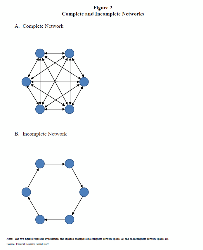 In the model studied by Allen and Gale, systemic risk arises through liquidity shocks that can have a domino effect, causing a problem at one bank to spread to others, potentially leading to failures throughout the system. In their model, interbank deposits are a primary mechanism for the transmission of liquidity shocks from one bank to another. Allen and Gale compare two canonical network structures: a "complete" network, in which all banks lend to and borrow from all other banks, and an "incomplete" network, in which each bank borrows from only one neighbor and lends to only one other neighbor. Figure 2, panel A, presents an example of a complete network, and figure 2, panel B, an example of an incomplete network.