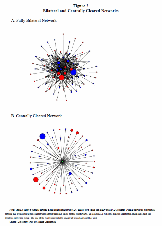 By taking one side of every trade, a central counterparty serves to transform the mesh network shown in panel A of figure 3 into something that looks more like the hub-and-spoke network illustrated in panel B. This network structure has no effect on the exposure of individual market participants to the assets or indexes underlying the derivatives contracts in question, but it dramatically simplifies and improves the transparency of the network of counterparty risk exposures.17
