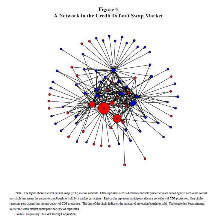 Finally, let me turn to data requirements. Both the research that I have highlighted today and practical experience demonstrate that market, prudential, and systemic risk authorities need detailed information on derivatives transactions and bilateral positions to assess evolving market risks and to execute their financial stability responsibilities. Indeed, the Federal Reserve has already used preliminary information from the Depository Trust & Clearing Corporation's Trade Information Warehouse to construct network graphs of the CDS market such as the one illustrated in figure 4. The data enable identification, for example, of firms, such as A and B in figure 4, that are large net sellers of protection. Such information can play a valuable role in supervision. Moreover, the analyses for monitoring and measuring systemic risks suggested and described by Gai, Haldane, and Kapadia and by Cont, Moussa, and Santos require this kind of detailed data to gain a holistic view of systemic risk.