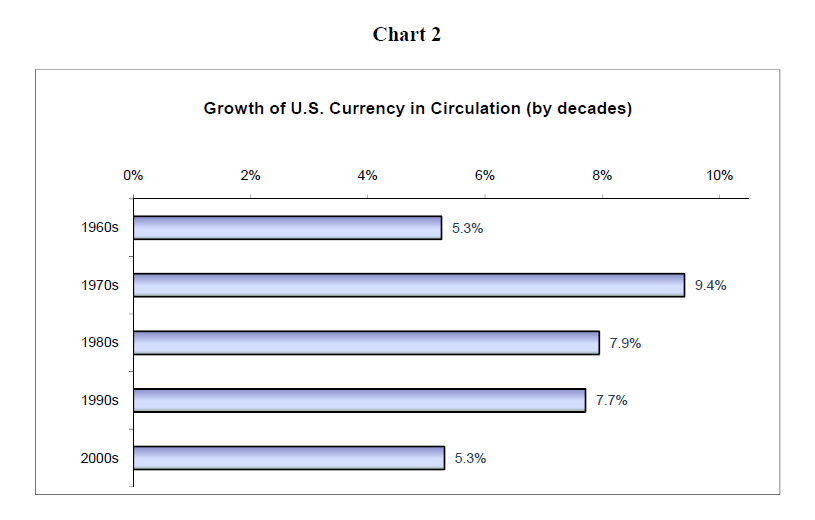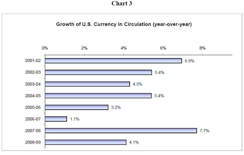 The foreign component of currency in circulation is estimated to have increased significantly beginning in the late 1980s and continues to grow today. In the 1990s, currency in circulation grew at an average annual growth rate of approximately 7.7 percent, resulting primarily from increases in foreign demand and a surge in demand at the end of the decade.7 As shown in chart 2, during the decade beginning in 2000, the average annual growth rate of currency in circulation moderated to about 5.3 percent (which is a rate consistent with growth during the 1960s). As reflected in chart 3, however, annual growth rates began to decline in 2001 and significantly declined to below one percent in 2008 (through August). Demand slowed over this period partly because the value of the dollar decreased against many other major currencies; international markets gained trust in their own economies and national currencies; electronic payments displaced some cash usage; and the effect of the recent recession. This decline was reversed, however, beginning in September 2008, as currency demand increased significantly as a result of the financial crisis. Currency growth increased substantially, from 0.8 percent year-to-date through August 2008 to 7.7 percent for full-year 2008. As the effects of the financial crisis persisted, strong growth continued in 2009; currency in circulation increased from $775 billion at the end of 2007 to almost $900 billion by year-end 2009. As of May 31, 2010, the value of currency in circulation was $902.2 billion, or about 95.7 percent of total currency and coin in circulation.