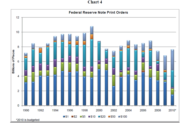 8. Chart 4 shows the Federal Reserve's annual currency print orders from the BEP from 1990 through 2010. Return to text