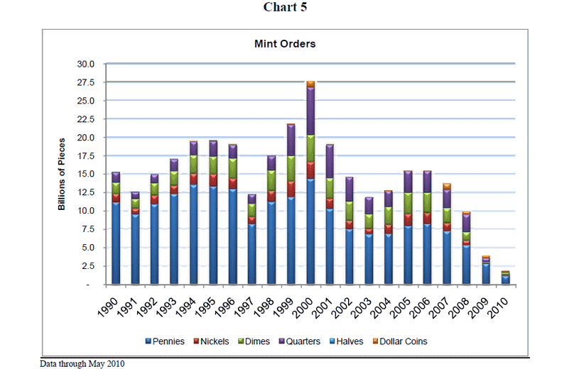 11. As of May 31, 2010, the Reserve Banks held about 1.5 billion pennies, 343 million nickels, and 546 million dimes. Return to text