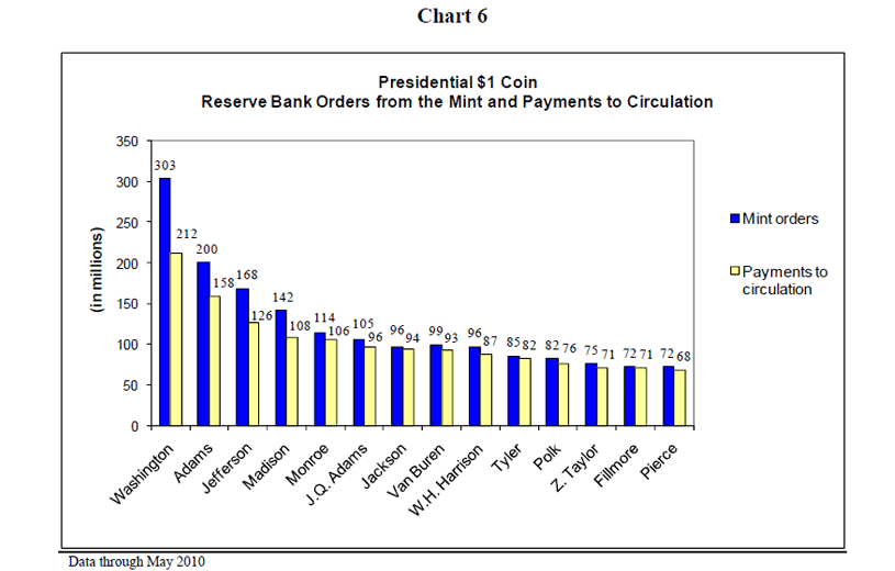 14. As chart 6 indicates, depository institution demand has decreased for each successive Presidential $1 coin design. About 70 percent of $1 coin payments to circulation occur during the special ordering periods for each new release. Return to text