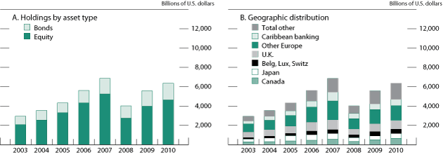 The claims survey measures U.S. holdings of foreign securities at the end of December each year. These data are collected at the individual security level by country of issuer for U.S. holdings of foreign bonds, equities, and short-term debt. Figure 2, panel A, shows U.S. holdings of foreign securities by asset type from 2003 to 2010. Most U.S. holdings of foreign securities are in foreign equities (about two-thirds as of December 2010), followed by long-term debt. As with foreign holdings of U.S. securities, U.S. investment in short-term foreign debt (not shown) is small, generally less than 10 percent of total U.S. cross-border portfolio holdings.