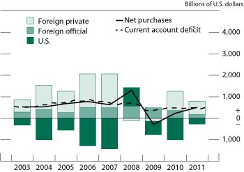 Source: For foreign official and foreign private, and in subsequent figures except as noted, staff estimates from data collected through the Treasury International Capital reporting system; for U.S. current account deficit, Bureau of Economic Analysis.