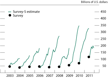 In order to obtain timelier information on cross-border securities positions between surveys, we can estimate monthly time series of positions to date by combining the annual survey data with the TIC S data.17 The monthly estimated positions between surveys are constructed in three steps for each asset type in the liabilities and claims surveys, as indicated in the following equation: