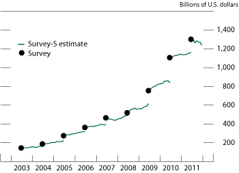 Return to textHowever, on the claims side, U.S. holdings of foreign securities, the survey and SLT figures for cross-border holdings of ABS differ by a substantial margin. The survey figure for U.S. holdings of foreign corporate ABS as a share of all such holdings is 11 percent while the corresponding SLT figure is 16 percent. While this difference could indicate that U.S. acquisitions of foreign ABS picked up markedly since December 2010, it seems likely that at least part of this difference might be due to changes or differences in valuation methods adopted by reporters in the SLT compared with those in the claims survey data; as noted in Bertaut and Pounder (2009), valuation is especially challenging for ABS. For such differences, the detailed survey data will be critical. We expect that comparison of the December 2011 SLT and claims survey data will reveal whether this difference reflects movements in ABS holdings or difficulties with ABS valuation.