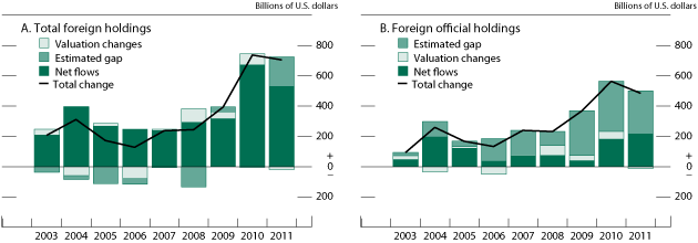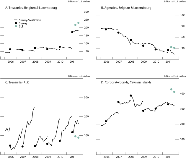 A more recent example is movements in foreign holdings of U.S. Treasury securities, a topic of interest given the large issuance of debt by the Treasury, large purchases of Treasury securities by the Federal Reserve, and the announcements by some large holders of U.S. Treasury securities, most notably China, of intentions to diversify their reserve asset holdings, presumably away from Treasury securities. The Survey-S estimates, shown in panel A of figure 7 by the sum of the pale green and dark green bars, indicate that total foreign holdings of U.S. Treasury securities rose about $500 billion in 2011--substantially less than the $750 billion increase over the previous 12-month period. However, the survey data from June 2011, released in late April 2012 and shown by the black line, indicate that foreign holdings of U.S. Treasury securities from mid-2010 to mid-2011 increased nearly as much as they had in the previous year--about $700 billion. The discrepancy between the actual change in holdings and the Survey-S estimates is shown by the positive medium green bar. Because valuation changes for Treasury securities are typically fairly small relative to the total change in holdings, this positive "gap" indicates the extent to which reported net purchases of Treasury securities likely understated actual foreign acquisitions. There are several possible explanations for this gap and investigation is ongoing. First, it is possible that some cross-border transactions in the huge Treasury securities market are missed in the TIC S reporting: In 2011, average daily trading volume in Treasury bonds was on the order of $500 billion or more than twice the amount of the gap for the year of 2011.18 Alternatively, custodial bias could be a complicating factor: If U.S. residents purchase Treasury securities in the U.S. market but then entrust them to foreign custodians, the TIC S would (correctly) not record the purchases but the survey could count the securities as held by foreigners.