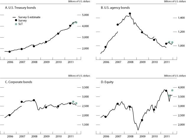 Although the initial SLT data for September and December should still be regarded as somewhat preliminary, the SLT readings nonetheless indicate changes in patterns of securities holdings that are in some ways quite different from the movements estimated using other available data. First, the new data indicate that U.S. investors shed rather than augmented their holdings of European long-term bonds late last year, a time that saw unusual strains in European financial markets. Second, these data indicate two trends in foreign holdings of U.S. Treasury securities in late 2011: a stronger overall foreign appetite for U.S. Treasury securities but a considerably larger decline in Chinese holdings of U.S. Treasury securities during late 2011 than had been estimated earlier. This data revision for China was not surprising: Data for China are typically revised when the annual TIC survey data become available. However, the magnitude and direction of the revision were surprising relative to earlier years, and with the SLT, we are able to see that change much sooner than we have in the past.5