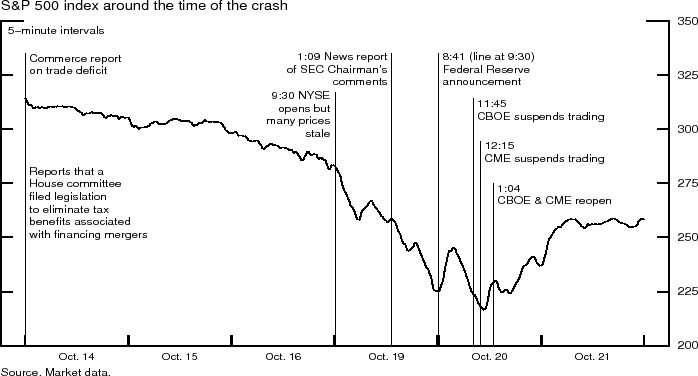 On October 19, 1987, the stock market, along with the associated futures and options markets, crashed, with the S&P 500 stock market index falling about 20 percent. The market crash of 1987 is a significant event not just because of the swiftness and severity of the market decline, but also because it showed the weaknesses of the trading systems themselves and how they could be strained and come close to breaking in extreme conditions. The problems in the trading systems interacted with the price declines to make the crisis worse. One notable problem was the difficulty gathering information in the rapidly changing and chaotic environment. The systems in place simply were not capable of processing so many transactions at once.1 Uncertainty about information likely contributed to a pull back by investors from the market. Another factor was the record margin calls that accompanied the large price changes. While necessary to protect the solvency of the clearinghouse processing the trades, the size of the margin calls and the timing of payments served to reduce market liquidity. Finally, some have argued that "program trades," which led to notable volumes of large securities sales contributed to overwhelming the system.