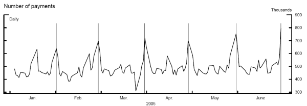 Table 1 compares the distribution of intervals between payments for our entire sample, January 1998 to June 2005 - excluding the week after September 11th - to the distribution of the