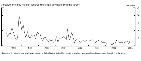 The behavior of the deviation of the effective rate from the target rate changed somewhat over the period. As shown in figure 3, the deviation of the effective federal funds rate from the target rate trended down from 1998 through the beginning part of 2004, but began to pick up somewhat during the first half of 2004. Hilton (2005) provides possible causes for these trends, which include lagged reserve accounting, a low absolute funds rate through mid-2004, and a corresponding pickup with an increase in the target rate through 2005.