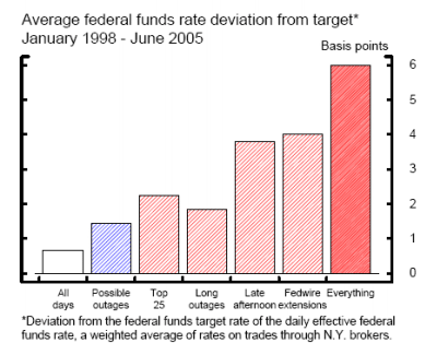 As our sketch of a theoretical model predicts, outages that are longer, or occur late in the afternoon, or days with extensions are associated with a positive deviation from the target. Outages that occur earlier in the day or are shorter are not. Uncertainty associated with operational problems that can be resolved well in advance of the close of Fedwire, such that a bank would not have to take out a discount window loan or incur an overnight overdraft, on average do not result in any different behavior in the federal funds market. However, increased uncertainty at the end of the day will lead reserve managers to seek funds in the market, bidding up the target rate.