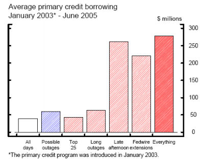 Figure 4(b) shows that primary credit borrowing picks up substantially when there is a possible outage in the late afternoon or that is accompanied by a Fedwire extension. Borrowing averaged nearly $300 million on days when the possible outage had all the problematic characteristics versus a sample average of about $40 million.
