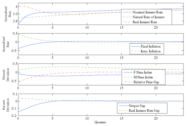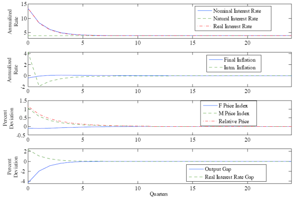 Figure 3 displays the equilibrium dynamics following a cost-push shock in the final goods sector. If the central bank were to engage in neutral policy (zero real-interest-rate gap), both sectors would experience inflation; however, inflation in the final goods sector would be extremely high. The central bank engages in contractionary policy to reduce inflation in both sectors, balancing the higher sensitivity of inflation in the intermediate goods sector to the nominal interest rate with the large initial effect on final goods inflation from the cost-push shock.