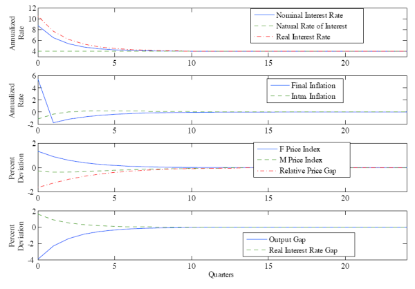 Figure 4 shows that the impulse responses to a cost-push shock in the intermediate goods sector retain the same qualitative characteristics as those in Figure 3, but carry the opposite sign in inflation rates and price levels. Once again both sectors experience inflationary pressure, with the intermediate goods sector experiencing a stronger initial push in this instance. Just as in the previous case, the central bank pursues contractionary policy in response to the cost-push shock. Nevertheless, since inflation in the intermediate goods sector is more sensitive to the nominal interest rate and is affected more by the cost-push shock, the central bank will set the magnitude of its response differently than when responding to a cost-push shock in the final goods sector.