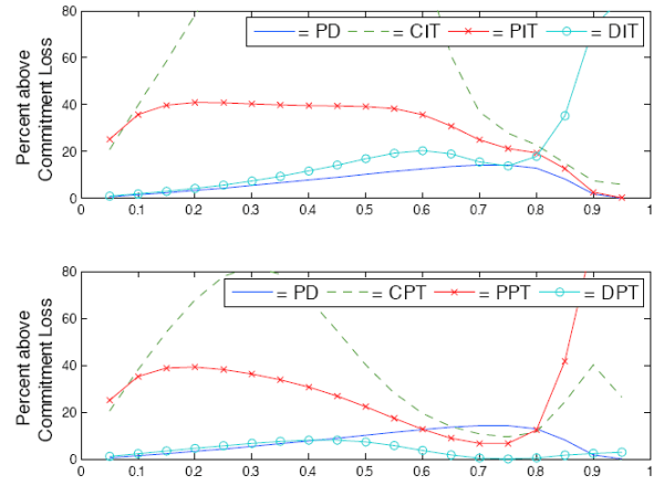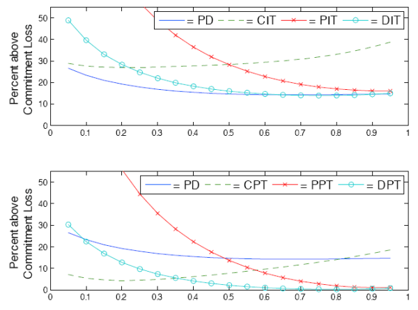 the performance of the optimal commitment solution. CPT performs much better than all other regimes and nearly as well as DPT. Targeting only intermediate prices proves to be less successful, with PPT performing worse than both PD and CIT. Figure 8 shows that the dual-targeting regimes continue to