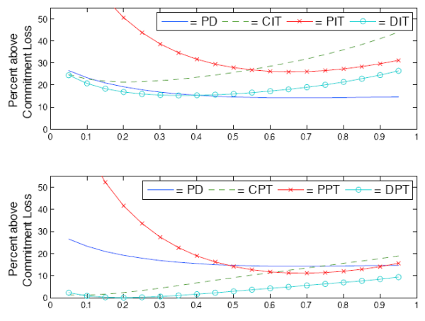 Figure 6 displays the results if price stickiness turns out to be different than expected (but still equal in the two sectors).19 If price stickiness turns out to be lower than expected, all four regimes that target either prices or inflation in only one sector perform worse than the dual targeting regimes. DIT performs very well only if price stickiness turns out to be less than the values used to calibrate the loss function. DPT performs well over the entire range and proves to be the most robust regime with respect to uncertainty in price stickiness.