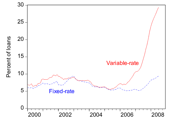 This figure shows the serious delinquency rate (loans 90 days or more past due or in the process of foreclosure) for subprime variable-rate and subprime fixed-rate mortgages, separately, from January 2000 through July 2008. Rates are derived from First American LoanPerformance data.