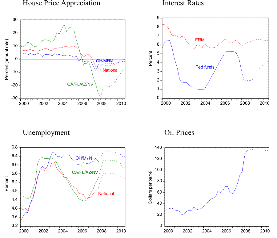 In this section, I simulate subprime mortgage defaults and prepayments during the 2008 to 2010 period and explore the effects of some policy option on those defaults and prepayments. Throughout this analysis, I draw house price, interest rate, and unemployment rate forecasts from Fannie Mae's and Freddie Mac's June 2008 monthly economic outlooks, and oil futures prices