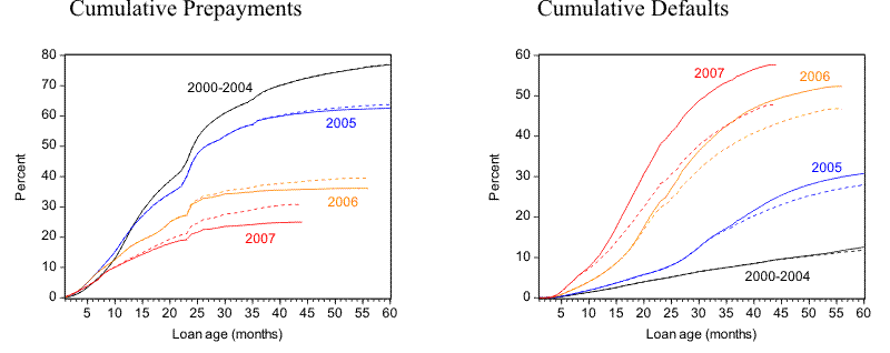 This figure shows the simulated paths for cumulative prepayments and defaults under the baseline assumptions shown in Figure 6. Solid lines depict data through 2007; dashed lines represent simulated data through 2010. More recent vintages are more prone to default and less likely to prepay.