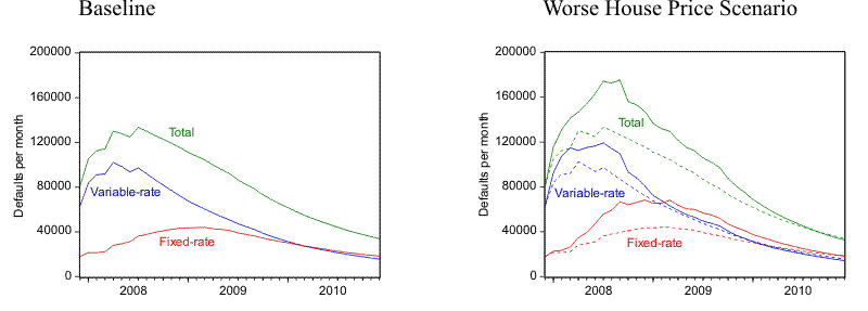 Under the alternative worse house price simulation the number of defaults is much higher. Total defaults exceed 140,000 per month from March through December 2008, with variable-rate loans contributing nearly 120,000 per month during much of that time. Defaults on subprime fixed-rate loans increase to over 50,000 per month from the latter half of 2008 well into 2009. Not only does a worse house price environment increase the total number of subprime mortgage defaults, it also increases the duration over which we could expect to see extraordinarily high default rates, likely owing to the inability to refinance because of little to no (or even negative) equity.